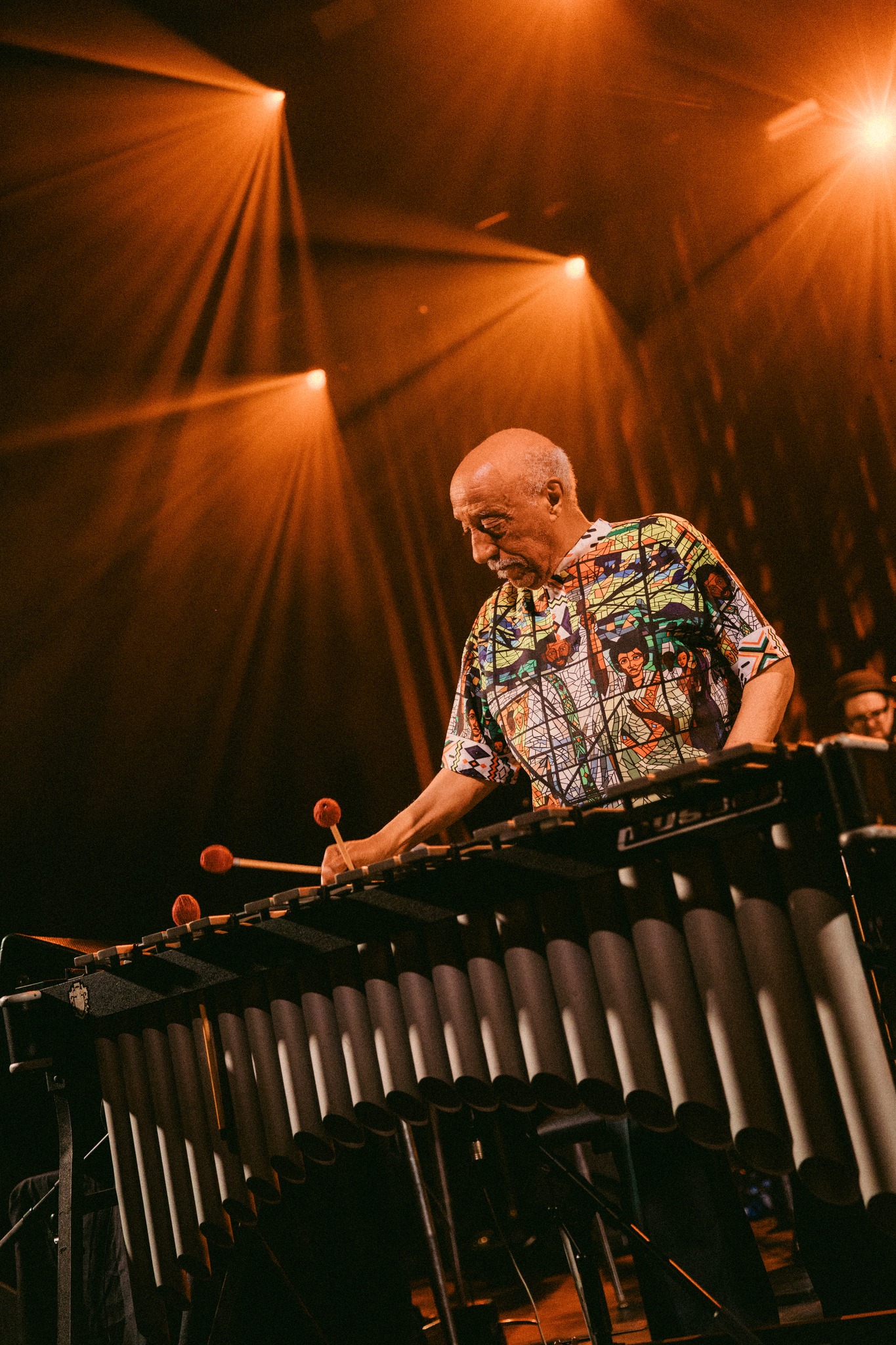 Opwarmen doet hij achter de vibrafoon en de rest van het concert zal hij voortdurend afwisselen tussen dat instrument, timbalen, conga's en bongo's en zijn Wurlitzer-piano. Het valt ons daarbij toch op dat de meester ondertussen wat moeilijker te been is en het grote werk eigenlijk overlaat aan zijn muzikanten, die hij stuk voor stuk uitgebreid laat soleren.