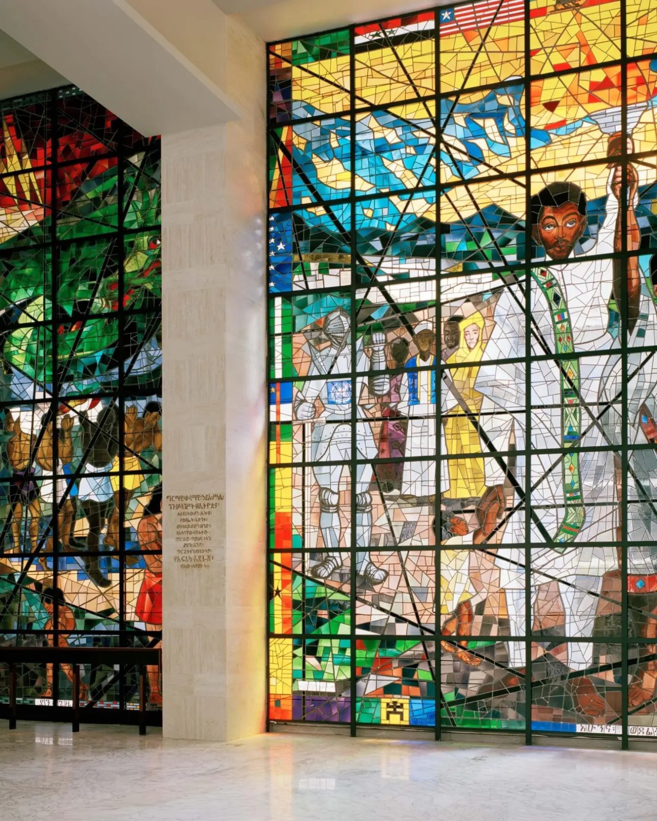 Mulatu wandelt het podium op in een veelkleurig hemdje waarin wij onmiddellijk één van de ontwerpen die de Ethiopische kunstenaar Afewerk Tekle maakte voor zijn glas-in-lood-triptiek in de Africa Hall in Addis Abeba, een werk getiteld The Total Liberation Of Africa. Het is een detail dat velen wellicht ontgaan zal zijn, maar waarmee Mulatu dus toch een subtiel statement maakte.